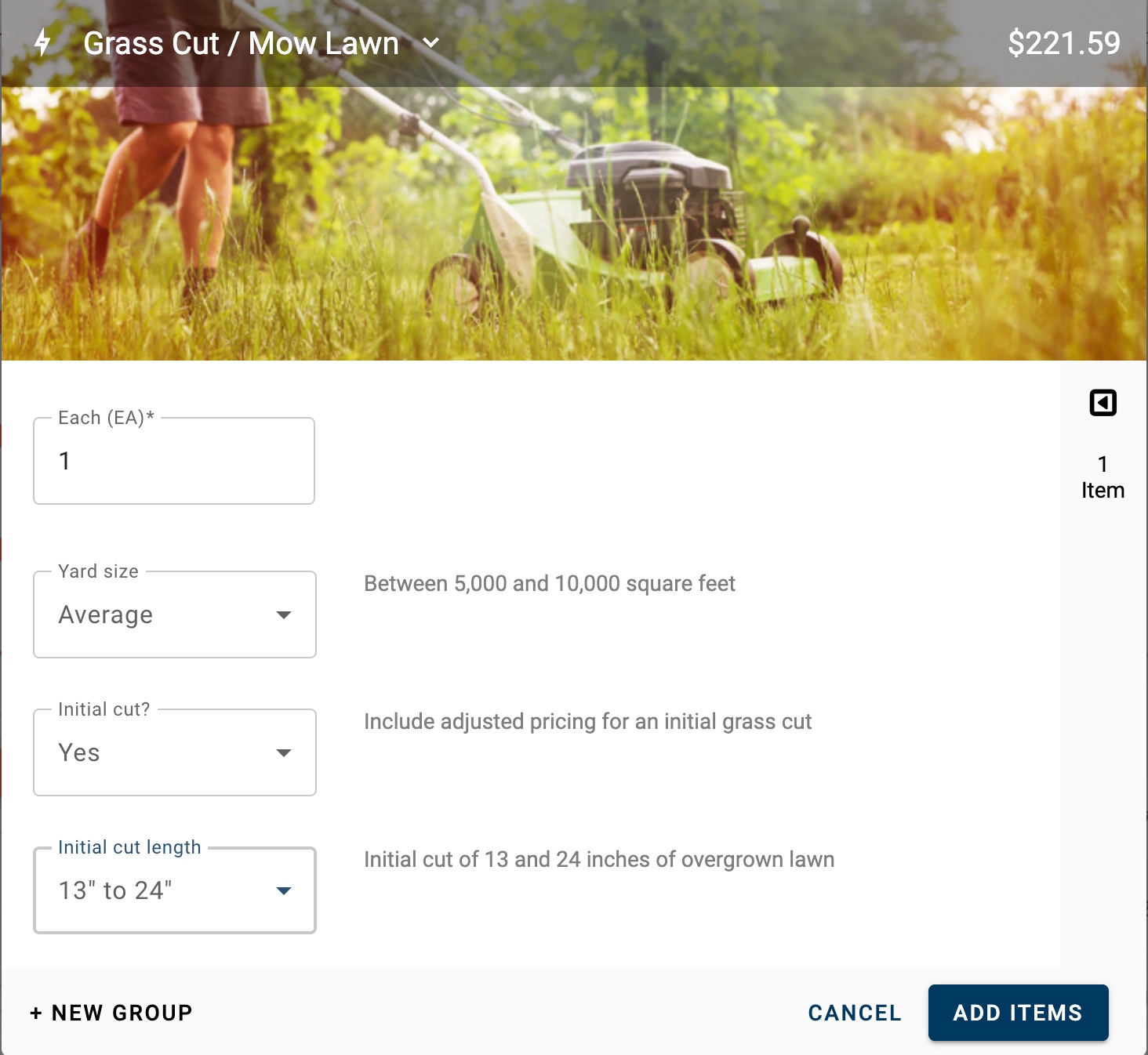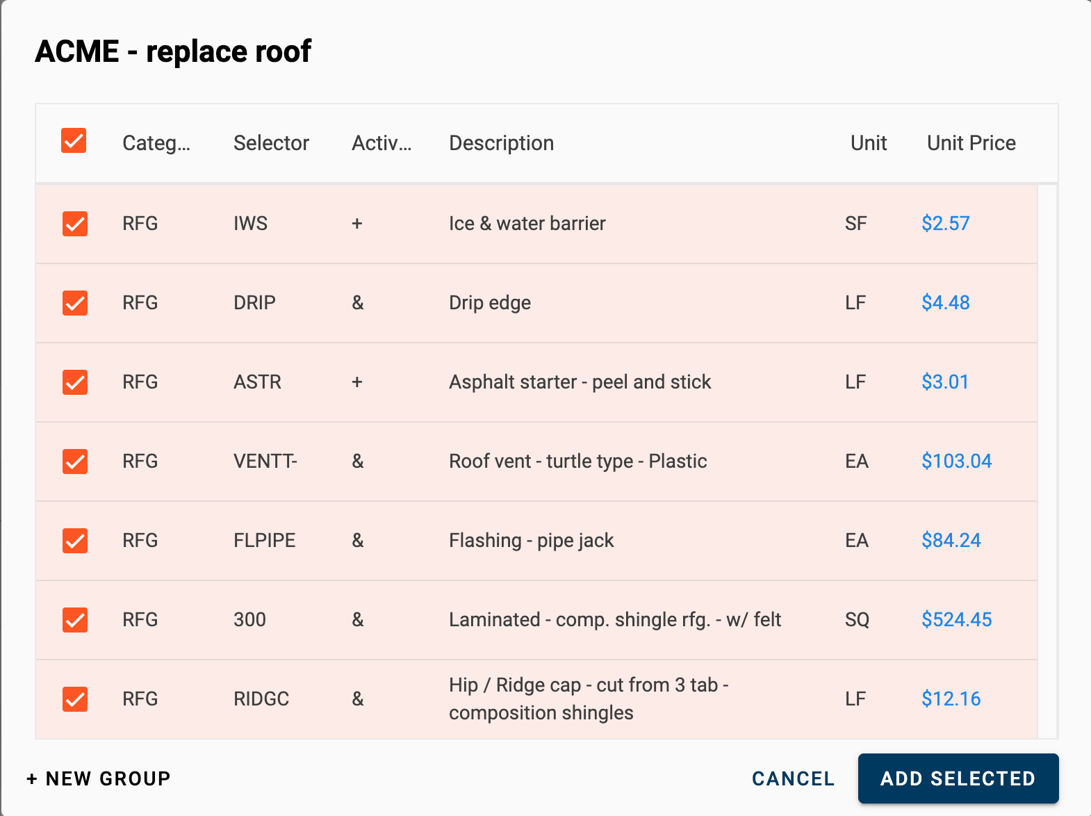 - To add all of the line items within a Quick Estimate at once, click the Add button next to the Quick Estimate you want.In the future, this will be modified so that clicking the Add button opens the Quick Estimate modal rather than adds it directly.To see the line items that are within a Quick Estimate, click on the name of the Quick Estimate. For Verisk-made Quick Estimates you can then fill in the quantity and make your dropdown selections. For custom-made Quick Estimates you can select those line items you would like to add. Clicking the + NEW GROUP button the left will add the Quick Estimate to a NEW group. Clicking the ADD SELECTED button on the right will add the Quick Estimate to the CURRENT group.